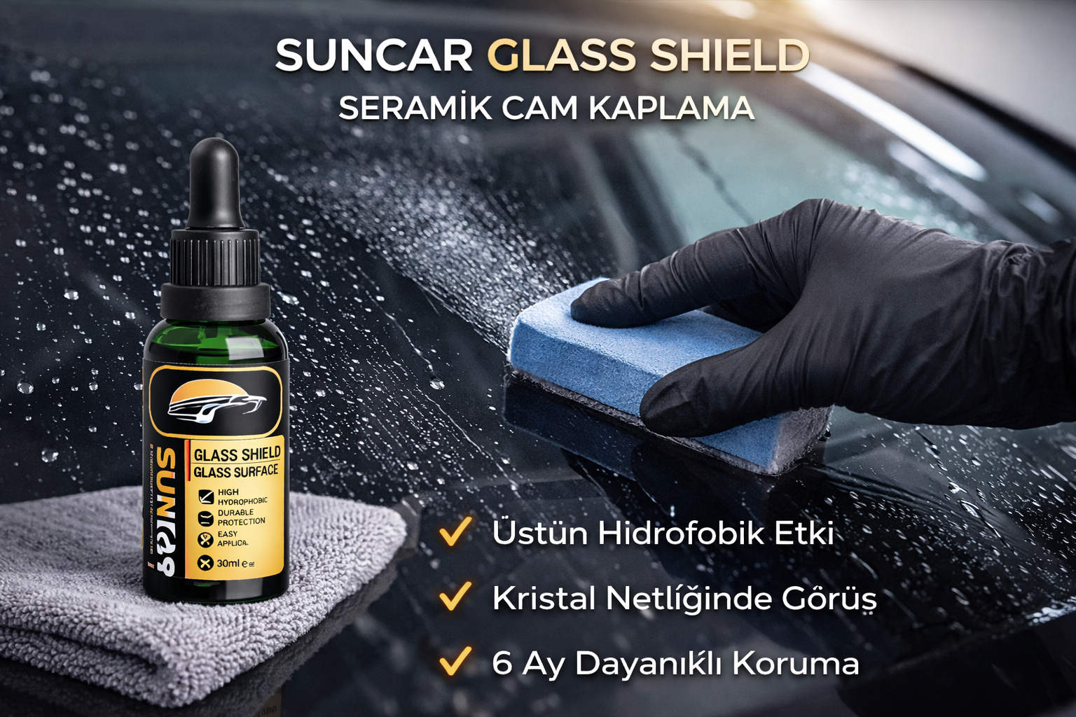 SUNCAR Glass Shield, araç cam yüzeylerinde su itici etki oluşturarak görüş netliğini destekleyen seramik cam kaplama ürünüdür. Yağmur suyunun cam üzerinde tutunmasını azaltmaya yardımcı olur, suyun daha kolay akmasını sağlar. Günlük kullanımda camın daha geç kirlenmesine katkı sunar, temizlik sürecini kolaylaştırır.