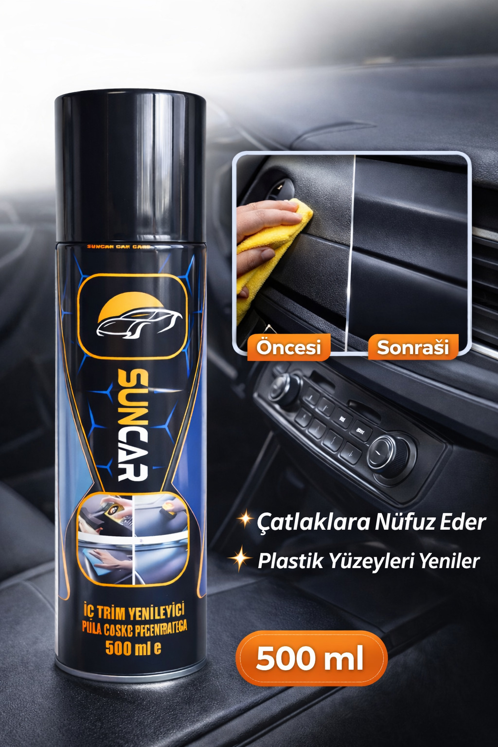 SUNCAR İç Trim Yenileyici, araç iç plastik ve vinil yüzeylerde zamanla oluşan solma ve mat görünümü gidermeye yardımcı olur. Yüzeye daha canlı, temiz ve bakımlı bir görünüm kazandırır.