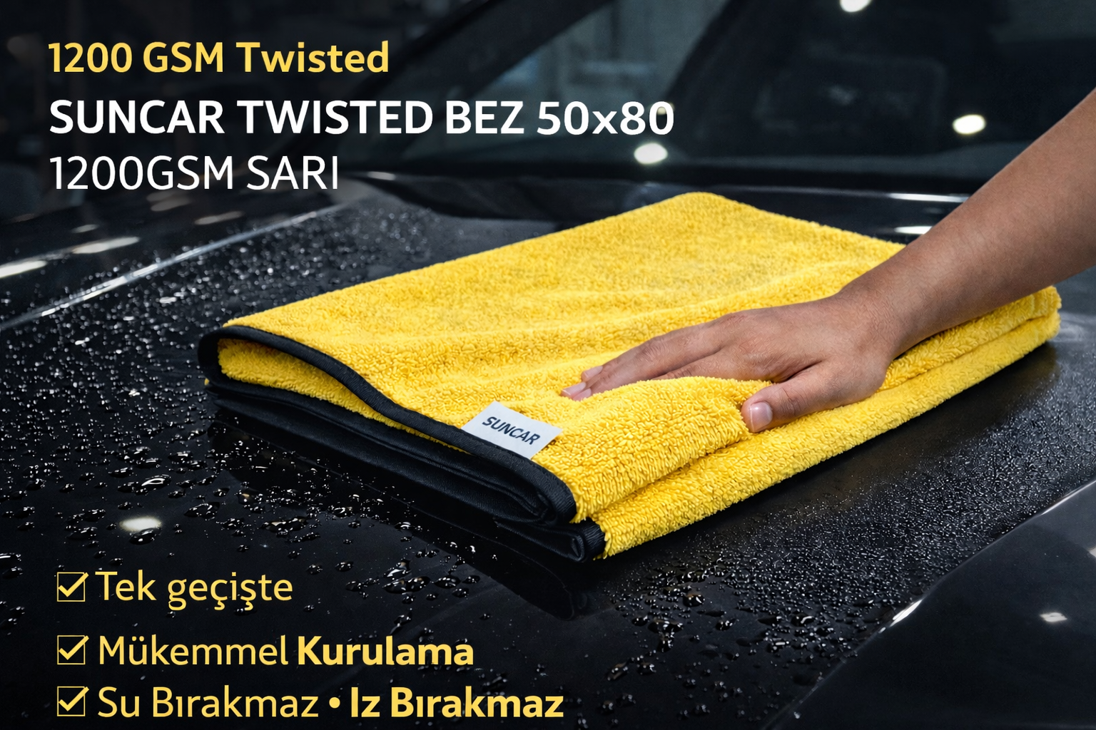 SUNCAR Twisted bez, 1200 GSM yüksek gramajlı twisted mikrofiber yapısı sayesinde üstün emiş gücü sunar ve araç kurutma işlemini tek bezle hızlıca tamamlamanıza yardımcı olur. Lif yapısı suyu anında içine hapsederek yüzeyde su kalıntısı bırakmaz, doğru kullanımda iz oluşumunu minimuma indirir. 50×80 cm büyük boyu, kaput, tavan ve cam gibi geniş yüzeylerde daha az geçişle daha fazla alanı kurutmanızı sağlar ve profesyonel detailing sonuçlarına yaklaşmanıza destek olur.